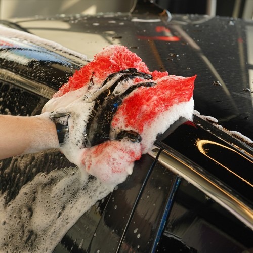 미트 세차스펀지와 함께 차량 세차 시