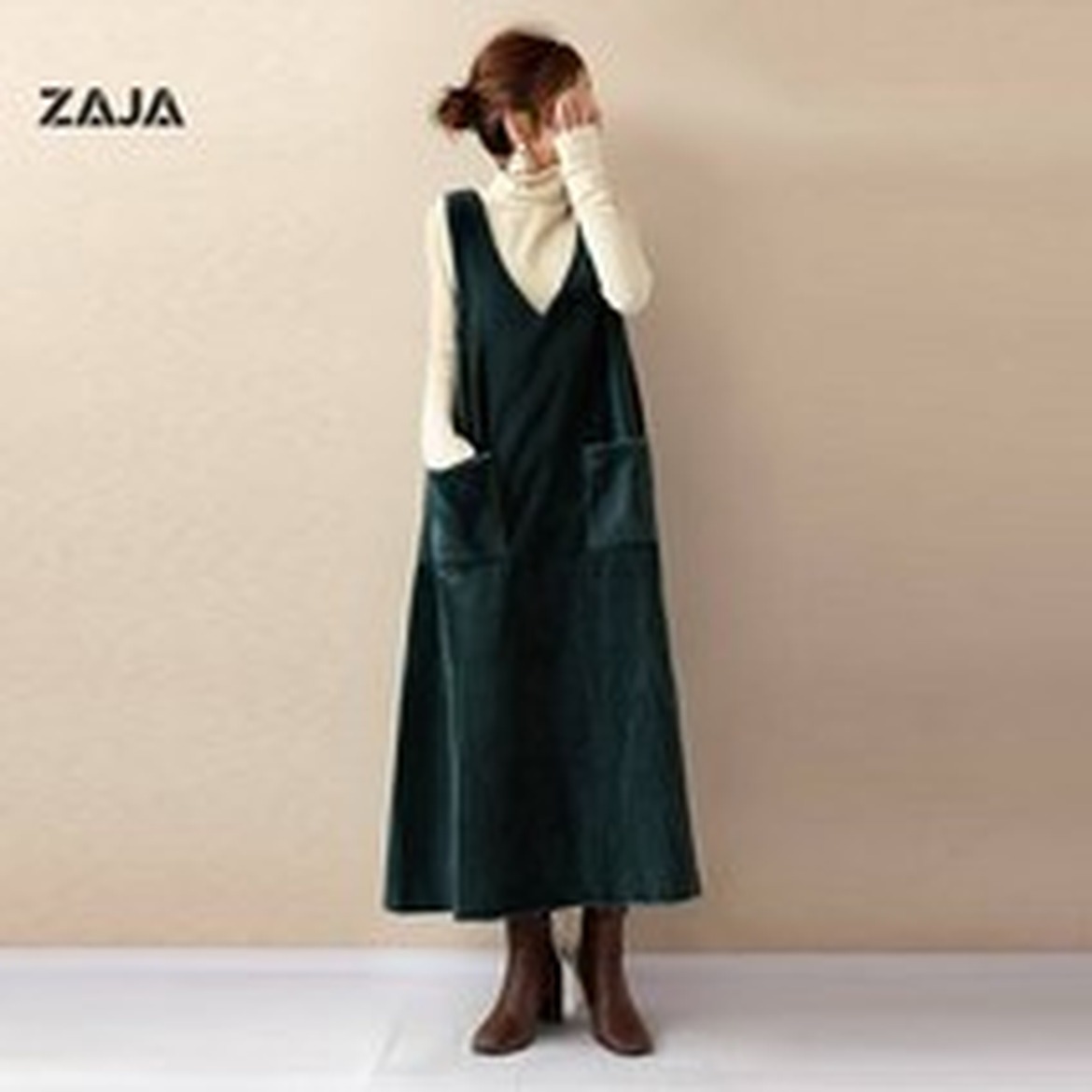 ZAJA 여성 추동 원피스 세트는 터틀넥 니트와 브이넥 민소매 디자인으로 구성되어 있어요.
