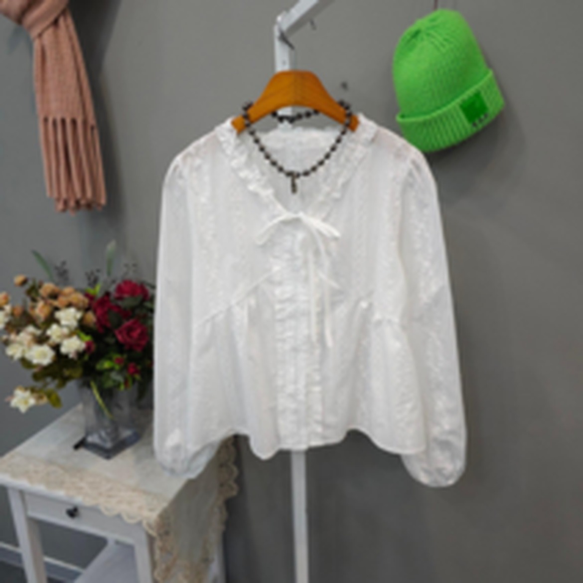 블라우스의 긴 소매는 전체적으로 여성스러운 실루엣을 만들어줘서 편안하면서도 우아한 인상을 줍니다.